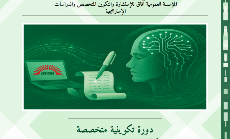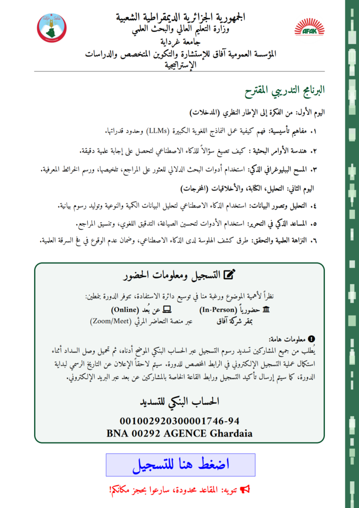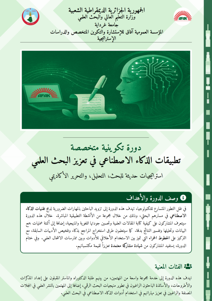 📢 إعلان هام: يعلن فريق التكوين عن فتح التسجيل في الدورة التكوينية المتخصصة “تطبيقات الذكاء الاصطناعي في تعزيز البحث العلمي”، وهي دورة احترافية موجهة للباحثين والطلبة وكل من يرغب في الارتقاء بمهاراته العلمية.