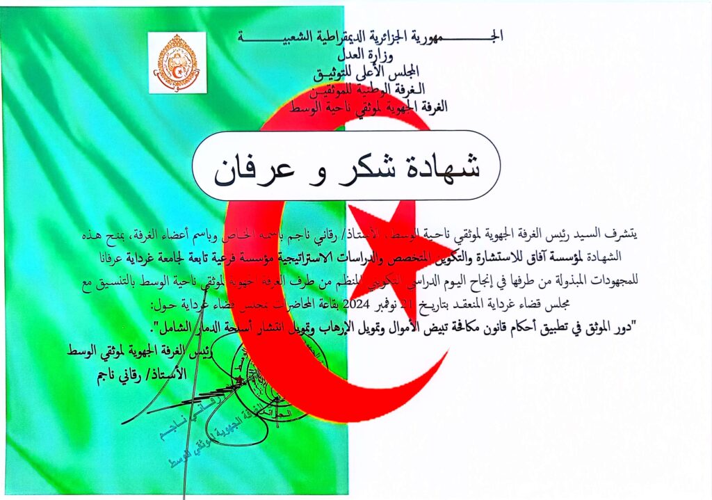 شهادة شكر وعرفان مقدمة للمؤسسة من طرف الغرفة الجهوية لموثقي ناحية الوسط